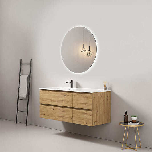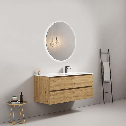 Mobile bagno sospeso 120 cm Bruno Medio Lavabo a Sinistra in Resina Specchio Tondo Retroilluminato - Fiji Wood