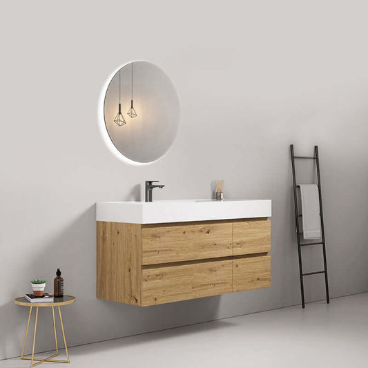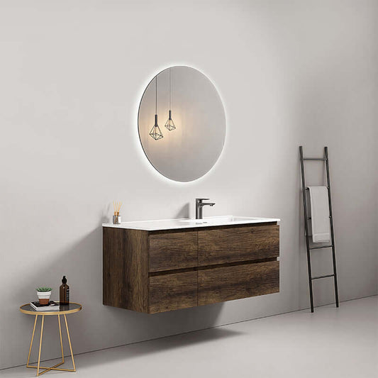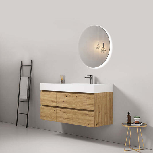 Mobile bagno sospeso 120 cm Bruno Medio Lavabo a Destra in Resina Specchio Tondo Retroilluminato - Fiji Wood