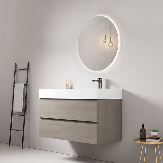 Mobile bagno sospeso 100 cm Beige Lavabo a Destra in Resina Specchio Tondo - Fiji Wood