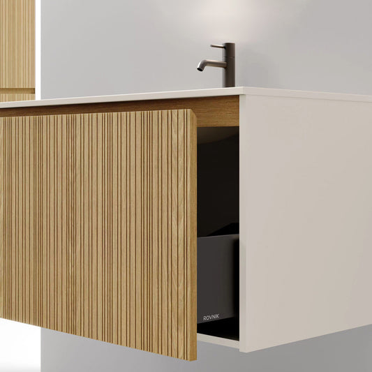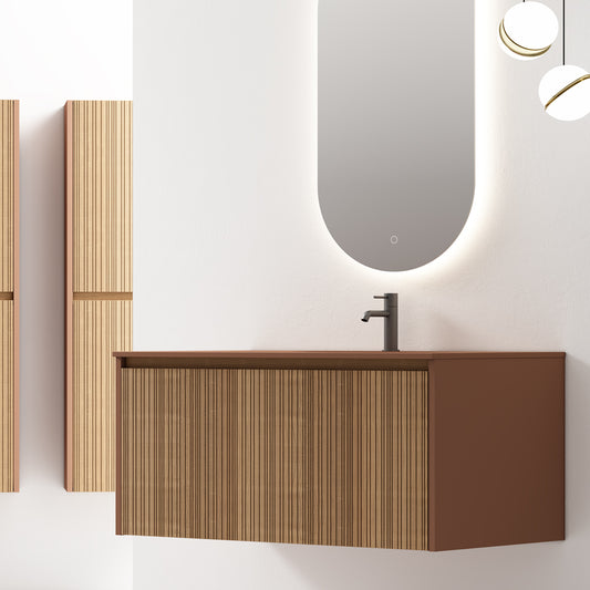 Mobile bagno sospeso 100 cm Beige Lavabo a Sinistra in Resina Specchio Quadro Retroilluminato - Fiji Wood