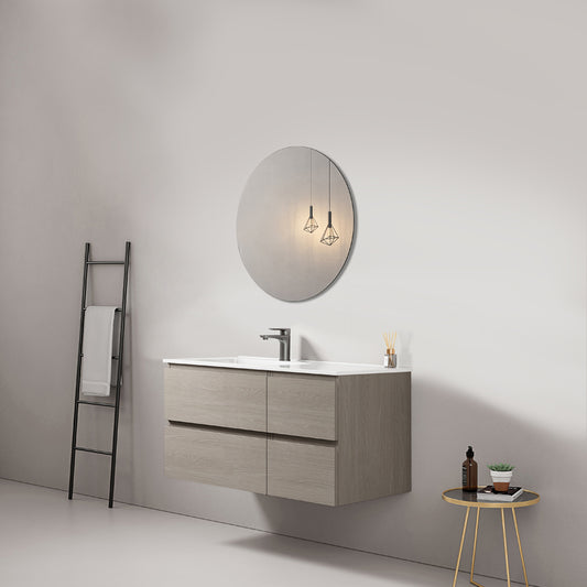 Mobile bagno sospeso 100 cm Beige Lavabo a Destra in Ceramica Specchio Tondo - Fiji Wood