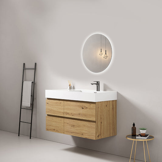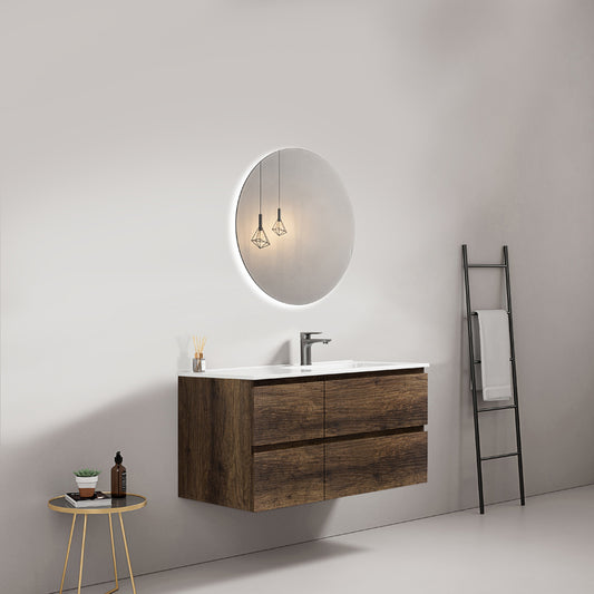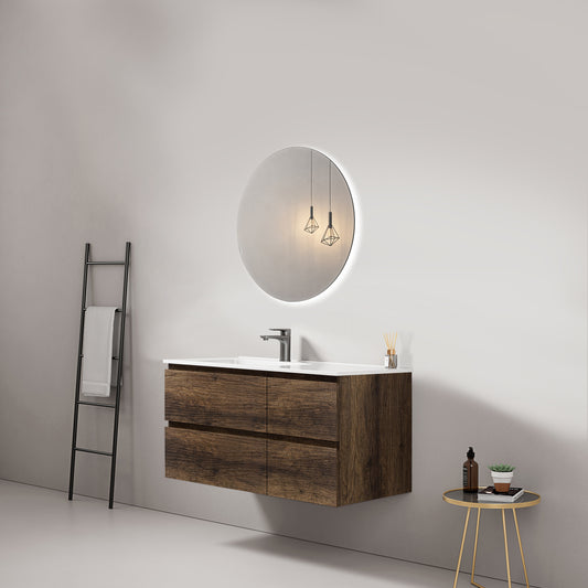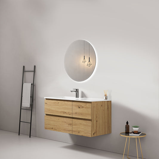Mobile bagno sospeso 100 cm Bruno Medio Lavabo in Ceramica Specchio Tondo Retroilluminato - Fiji Wood