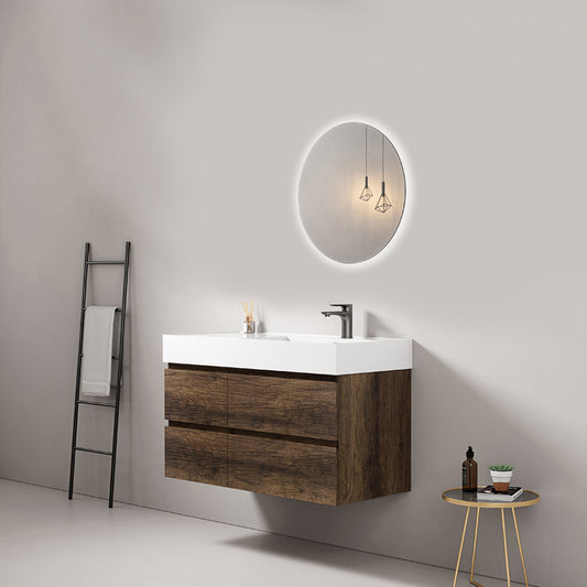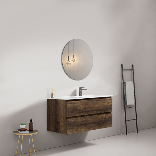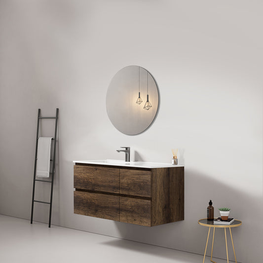 Mobile bagno sospeso 100 cm Bruno Scuro Lavabo a Destra in Resina Specchio Tondo - Fiji Wood