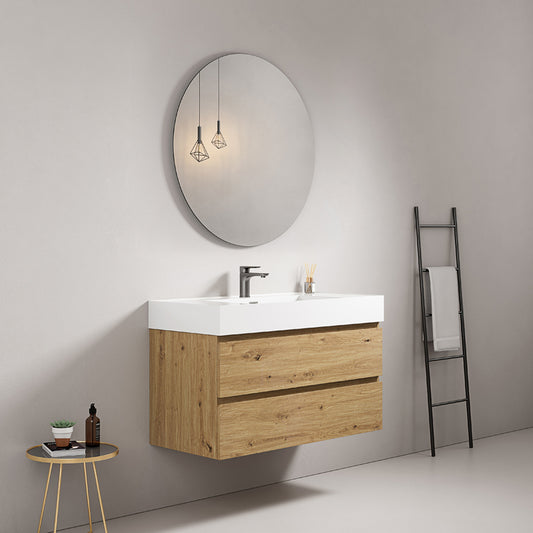 Mobile bagno sospeso 100 cm Bruno Medio Lavabo a Sinistra in Resina Specchio Tondo - Fiji Wood
