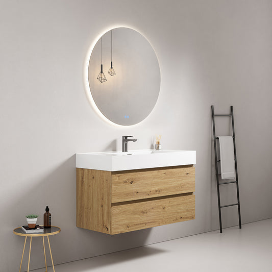 Mobile bagno sospeso 100 cm Bruno Medio Lavabo in Resina Specchio Tondo Retroilluminato - Fiji Wood