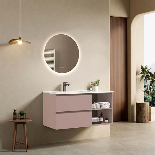 Mobile bagno sospeso 100 cm Rosa Retro Lavabo a Sinistra in Ceramica Specchio Tondo Retroilluminato - Fiji Paint Plus