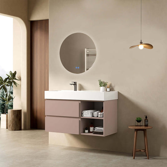 Mobile bagno sospeso 100 cm Rosa Retro Lavabo a Sinistra in Resina Specchio Tondo Retroilluminato - Fiji Paint Plus