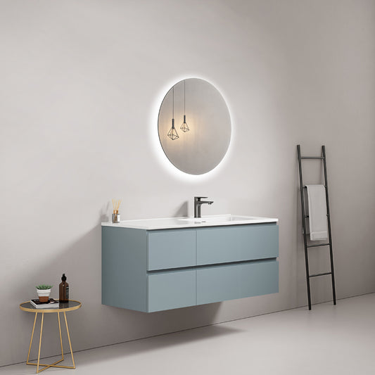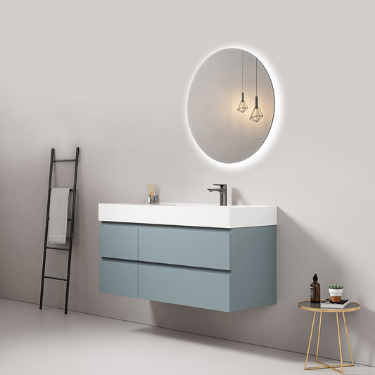 Mobile bagno sospeso 120 cm Blu Avio Lavabo a Destra in Resina Specchio Tondo Retroilluminato - Fiji Paint