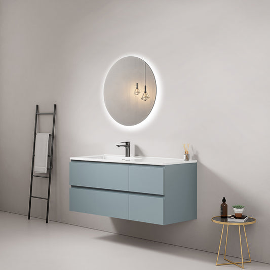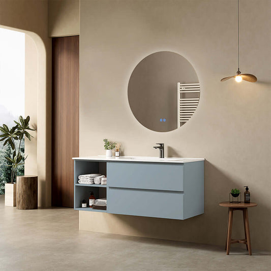 Mobile bagno sospeso 120 cm Blu Avio Lavabo a Sinistra in Ceramica Specchio Tondo Retroilluminato - Fiji Paint Plus