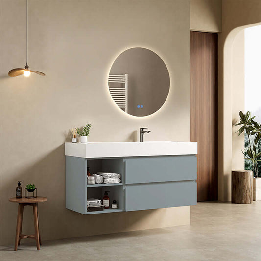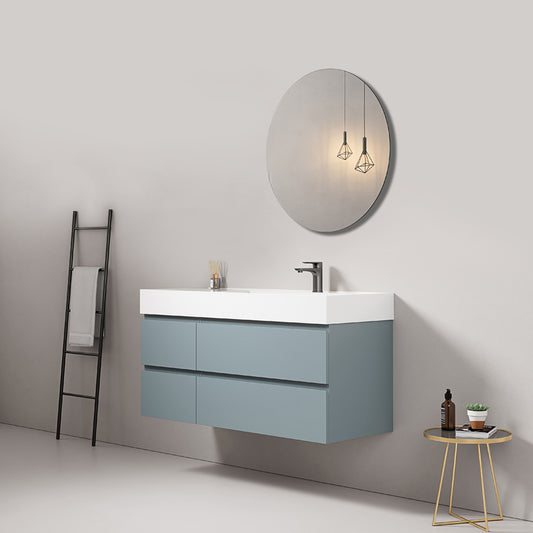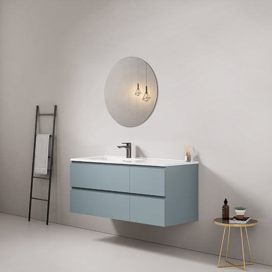 Mobile bagno sospeso 120 cm Blu Avio Lavabo a Destra in Resina Specchio Tondo - Fiji Paint Plus