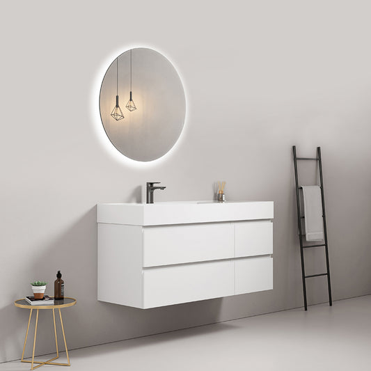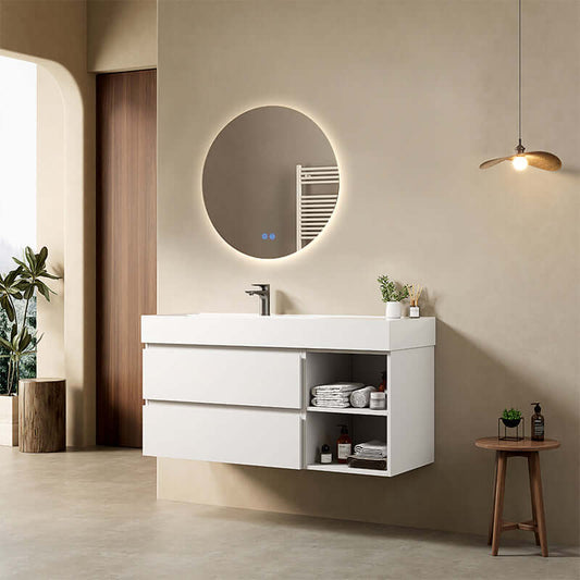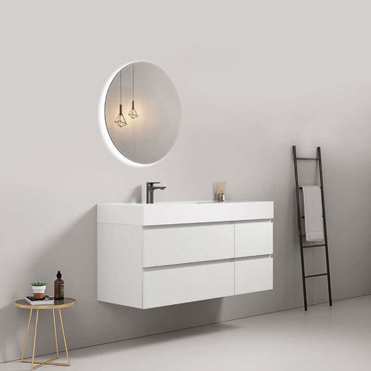 Mobile bagno sospeso 120 cm Bianco Lavabo a Sinistra in Resina Specchio Tondo Retroilluminato - Fiji Wood