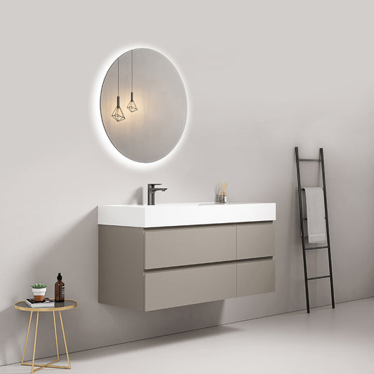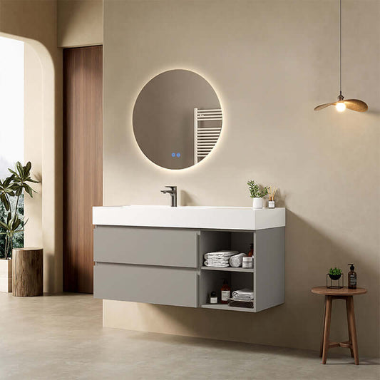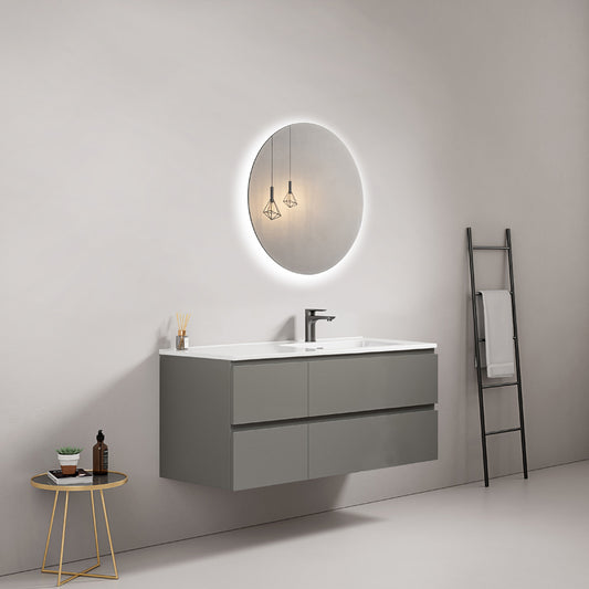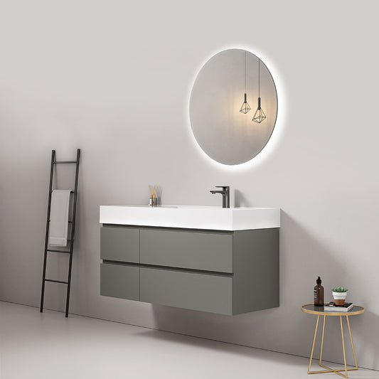Mobile bagno sospeso 120 cm Grigio Cenere Lavabo a Sinistra in Resina Specchio Tondo Retroilluminato - Fiji Paint