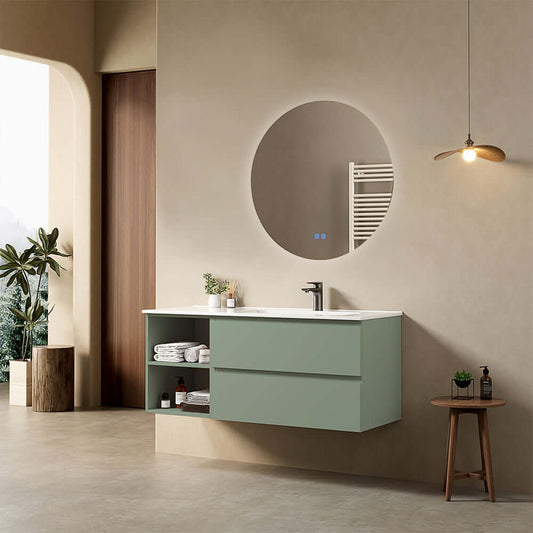 Mobile bagno sospeso 120 cm Verde Salvia Lavabo a Destra in Ceramica Specchio Tondo Retroilluminato - Fiji Paint Plus