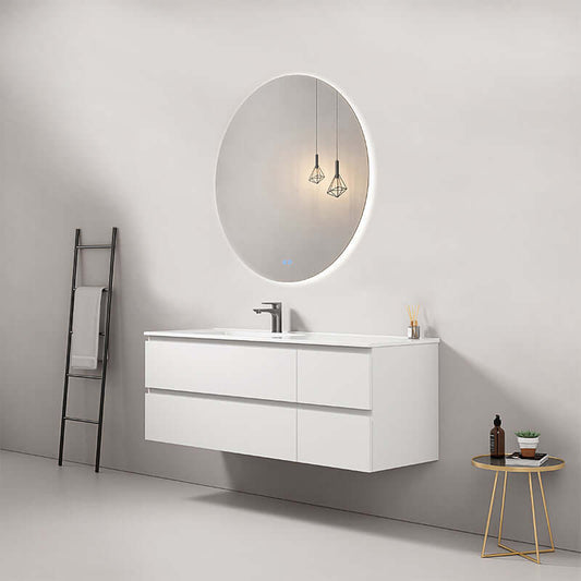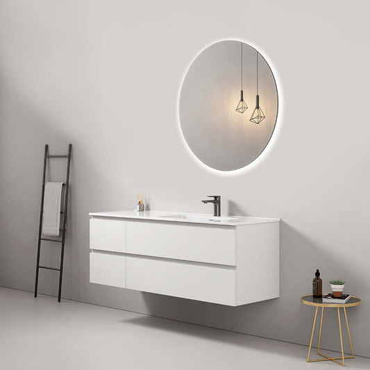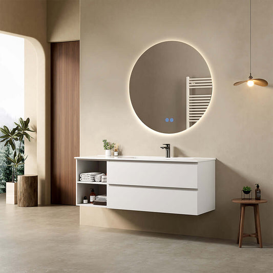 Mobile bagno sospeso 140 cm Bianco Lavabo a Sinistra in Resina Specchio Tondo Retroilluminato - Fiji Wood