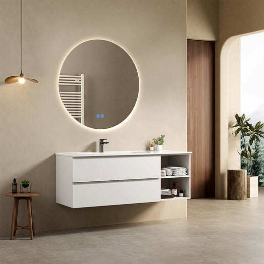 Mobile bagno sospeso 140 cm Bianco Lavabo a Destra in Resina Specchio Tondo Retroilluminato - Fiji Wood