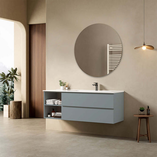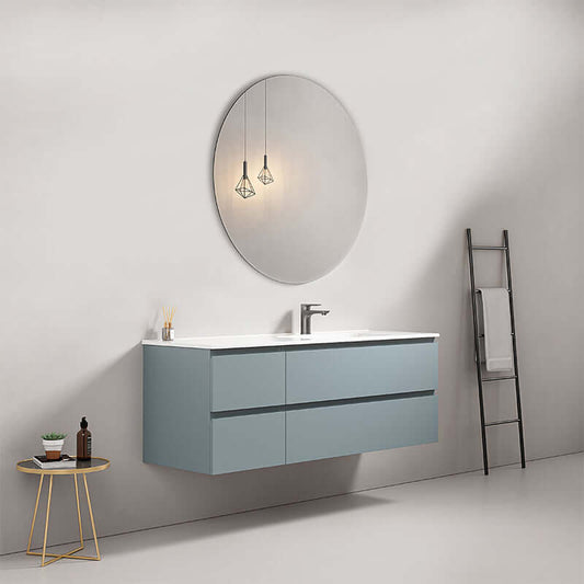 Mobile bagno sospeso 140 cm Blu Avio Lavabo a Destra in Resina Specchio Tondo - Fiji Paint Plus