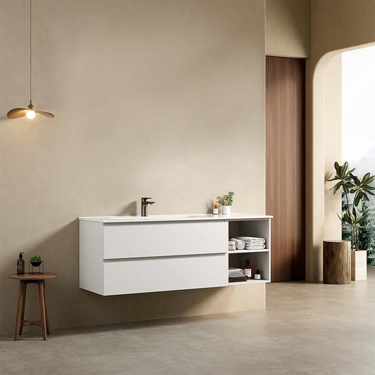Mobile bagno sospeso 140 cm Bianco Lavabo a Destra in Resina Senza Specchio - Fiji Wood