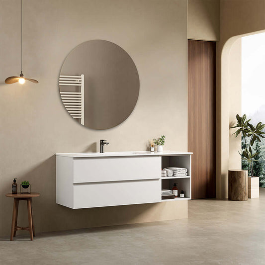 Mobile bagno sospeso 140 cm Bianco Lavabo a Destra in Resina Specchio Tondo - Fiji Wood