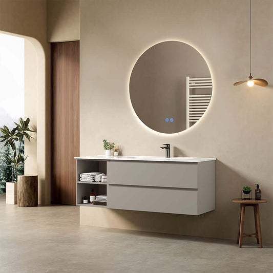 Mobile bagno sospeso 140 cm Grigio Cenere Lavabo a Destra in Resina Specchio Tondo Retroilluminato - Fiji Paint Plus