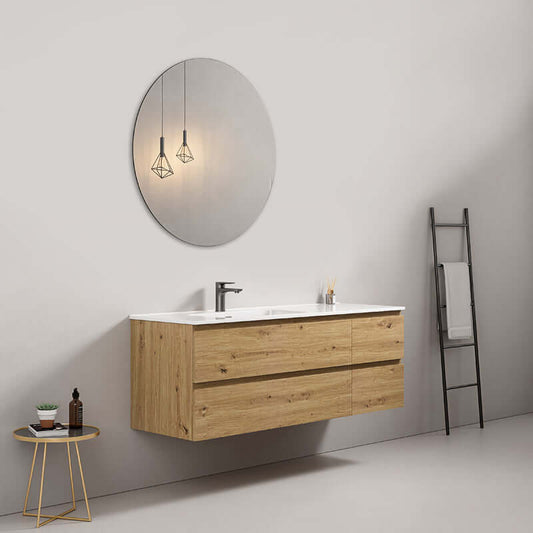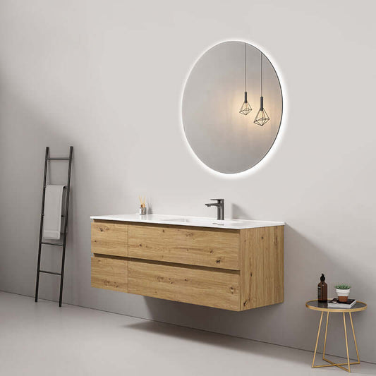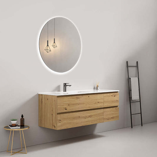 Mobile bagno sospeso 140 cm Bruno Medio Lavabo a Destra in Resina Specchio Tondo Retroilluminato - Fiji Wood