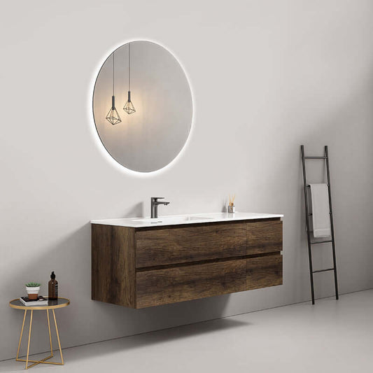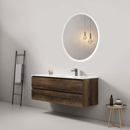 Mobile bagno sospeso 140 cm Bruno Scuro Lavabo a Destra in Resina Specchio Tondo Retroilluminato - Fiji Wood