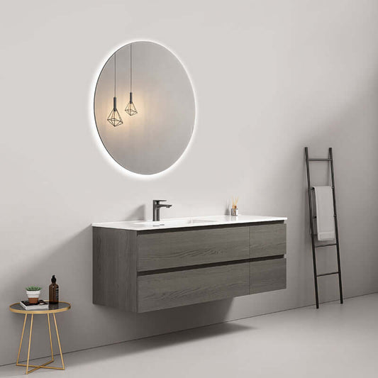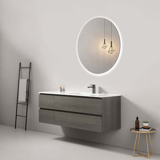 Mobile bagno sospeso 140 cm Grey Lavabo a Sinistra in Resina Specchio Tondo Retroilluminato - Fiji Wood