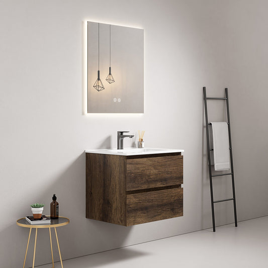 Mobile bagno sospeso 60 cm Bruno Scuro Lavabo in Ceramica Specchio Quadro Retroilluminato - Fiji Wood