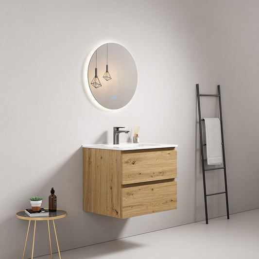 Mobile bagno sospeso 60 cm Bruno Medio Lavabo in Ceramica Specchio Tondo Retroilluminato - Fiji Wood