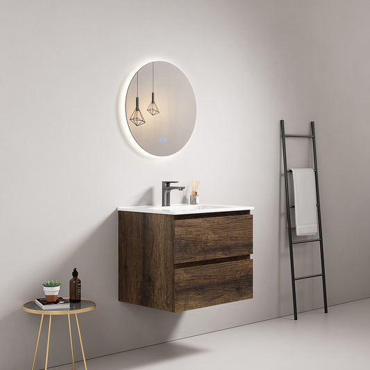 Mobile bagno sospeso 60 cm Bruno Scuro Lavabo in Ceramica Specchio Tondo Retroilluminato - Fiji Wood