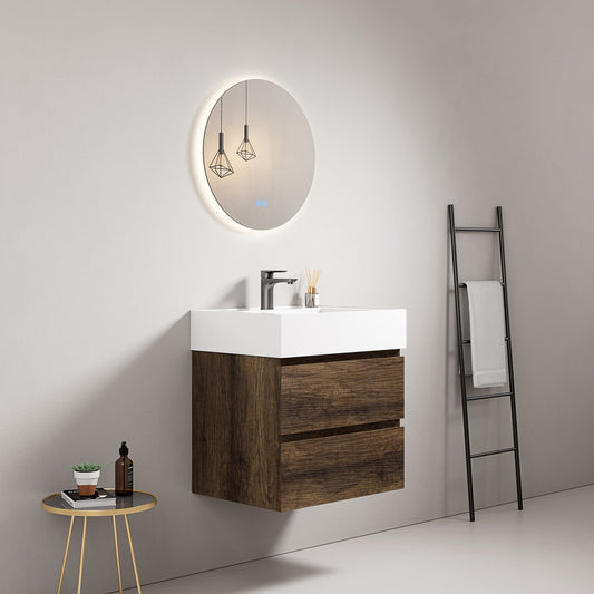 Mobile bagno sospeso 60 cm Bruno Scuro Lavabo in Resina Specchio Tondo Retroilluminato - Fiji Wood
