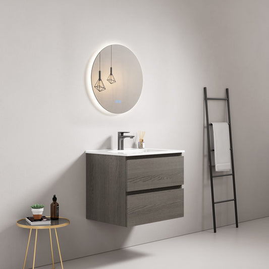 Mobile bagno sospeso 60 cm Grey Lavabo in Ceramica Specchio Tondo Retroilluminato - Fiji Wood