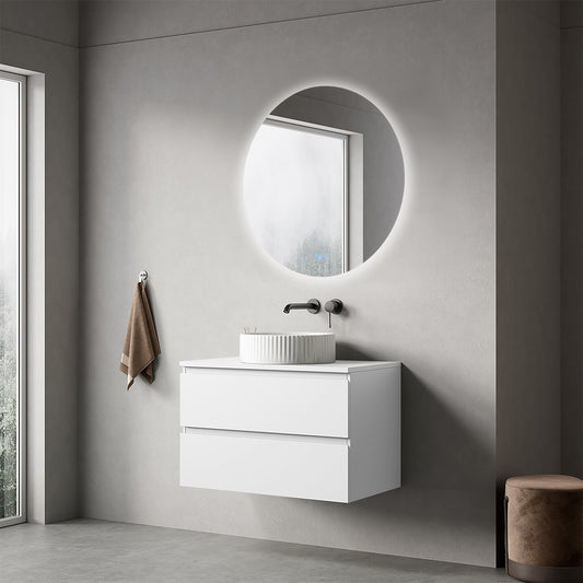 Mobile bagno sospeso 80 cm Bianco Opaco per Lavabo d'appoggio Specchio Tondo Retroilluminato - Fiji Paint Top