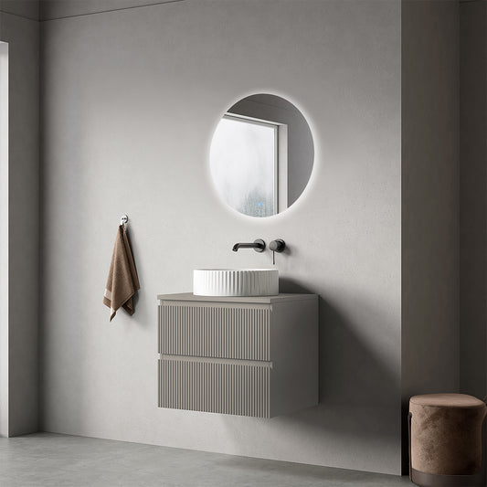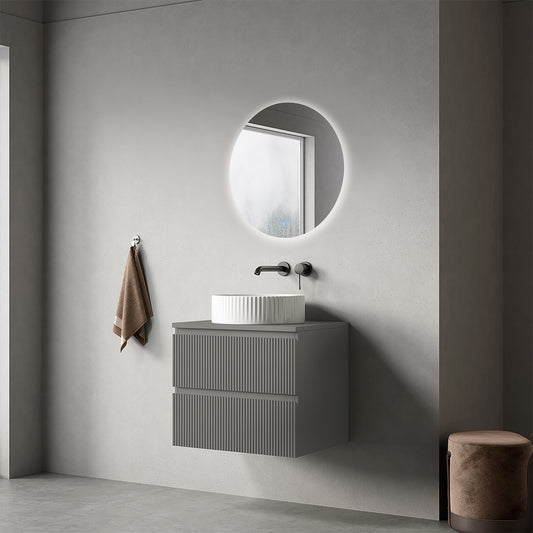 Mobile bagno sospeso cannettato 60 cm Grigio Cenere per Lavabo d'appoggio Specchio Tondo Retroilluminato - Fiji Paint Top Canneté
