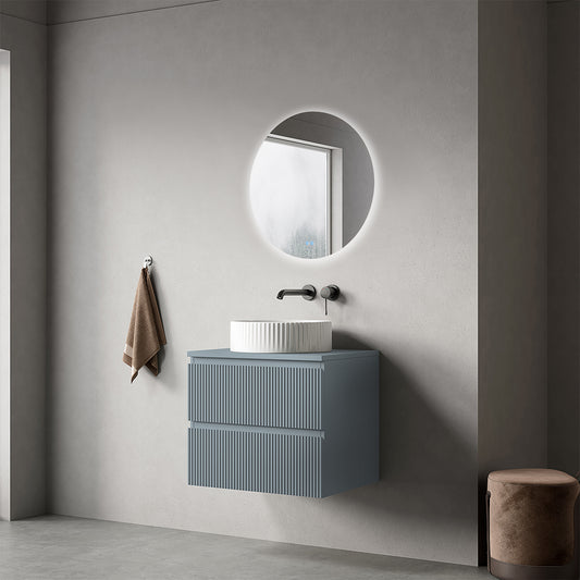 Mobile bagno sospeso cannettato 60 cm Blu Avio per Lavabo d'appoggio Specchio Tondo Retroilluminato - Fiji Paint Top Canneté