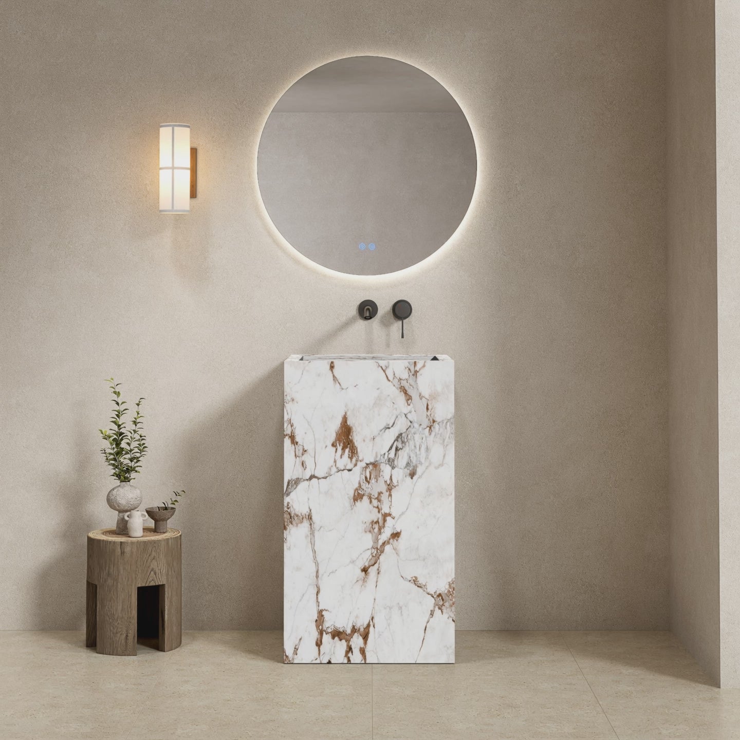 Lavabo Freestanding in Gres Lucido Capraia 60 cm Specchio Tondo Retroilluminato - Pedestal