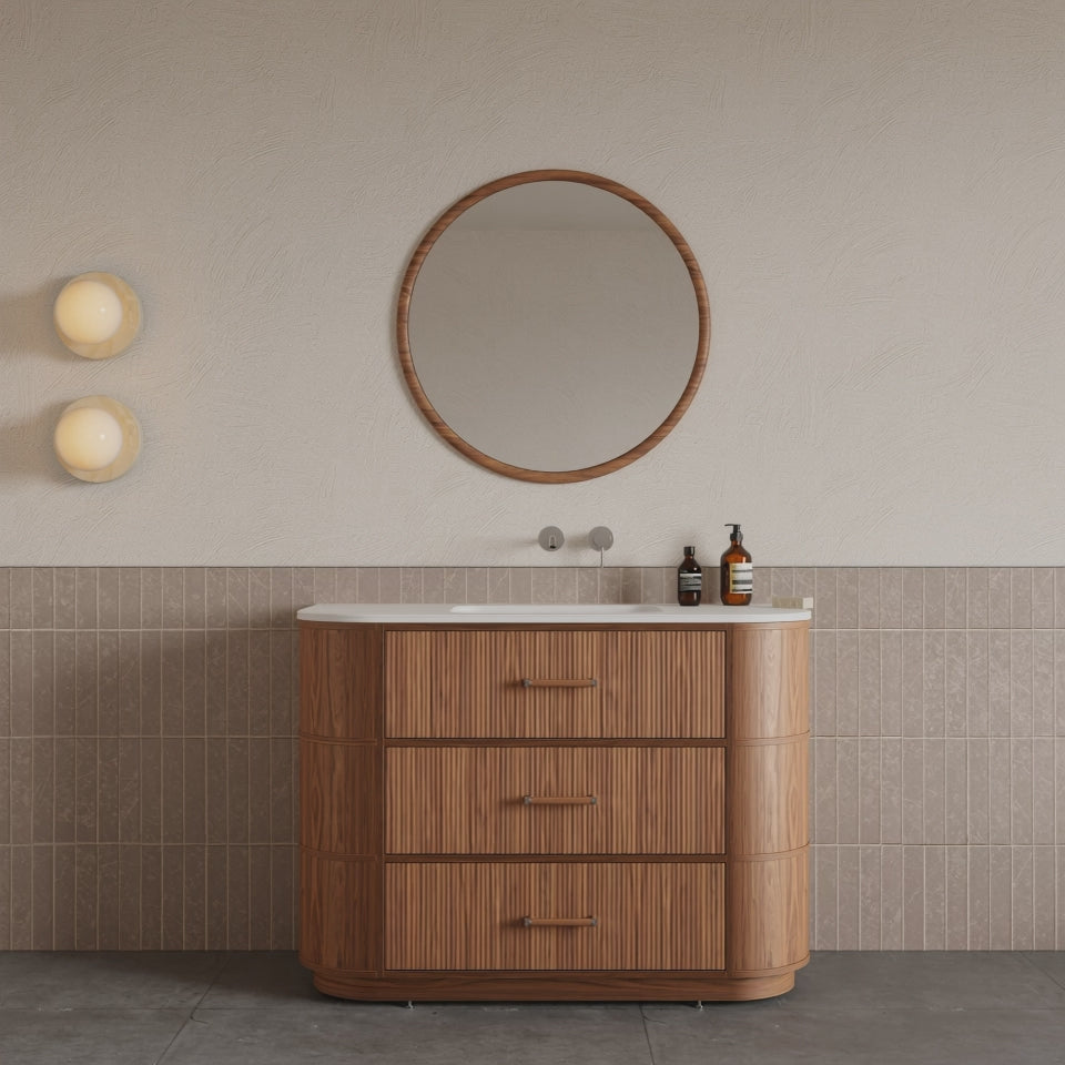 Mobile Bagno 120 cm A Terra Rovere Medio Con Specchio Tondo - Naru