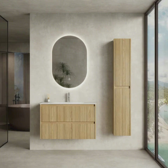 Mobile Bagno Sospeso 90 cm Rovere Chiaro Specchio Ovale Retroilluminato - Pace Plus