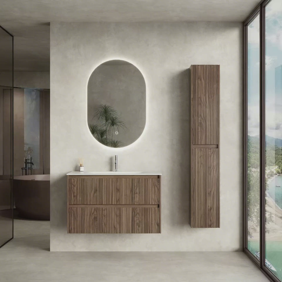Mobile Bagno Sospeso 90 cm Rovere Scuro Specchio Ovale Retroilluminato - Pace Plus