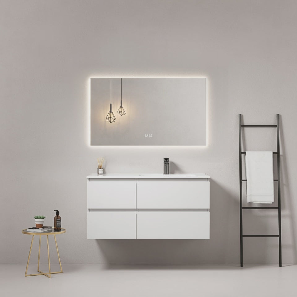 Mobile bagno sospeso 100 cm Bianco Lavabo a Destra in Ceramica Specchio Quadro Retroilluminato - Fiji Paint