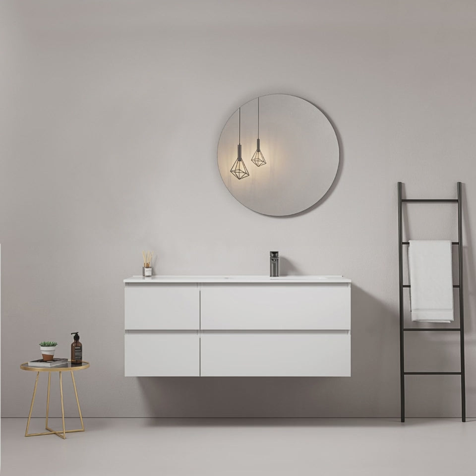 Mobile bagno sospeso 120 cm Bianco Lavabo a Destra in Ceramica Specchio Tondo - Fiji Paint