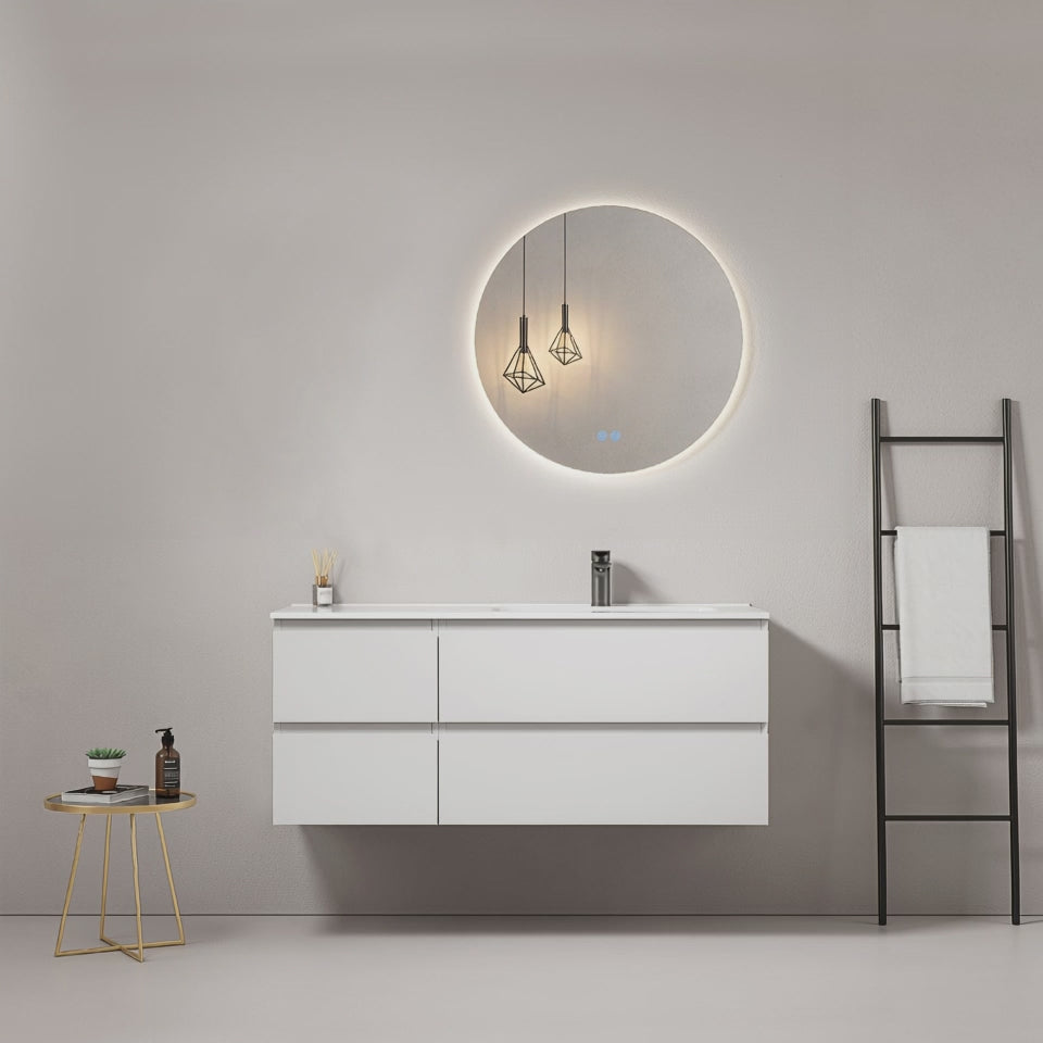 Mobile bagno sospeso 120 cm Bianco Lavabo a Destra in Ceramica Specchio Tondo Retroilluminato - Fiji Paint