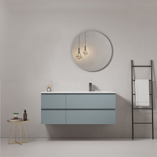Mobile bagno sospeso 120 cm Blu Avio Lavabo a Destra in Ceramica Specchio Tondo - Fiji Paint
