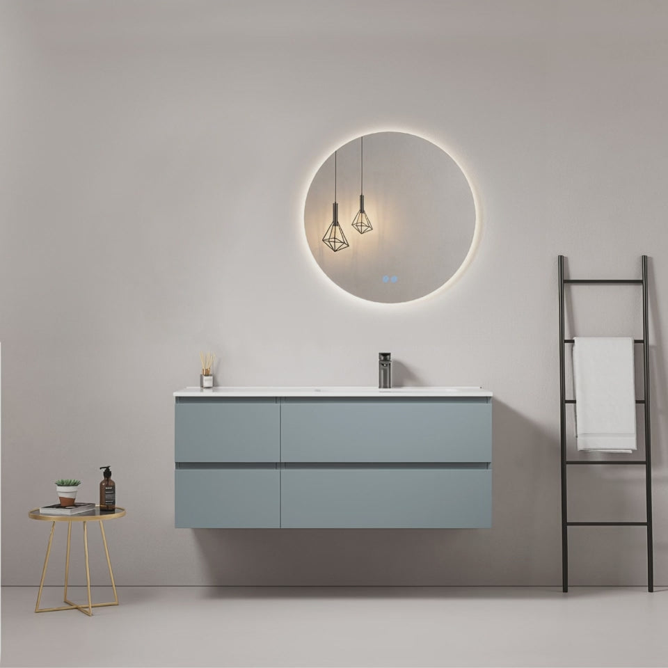 Mobile bagno sospeso 120 cm Blu Avio Lavabo a Destra in Ceramica Specchio Tondo Retroilluminato - Fiji Paint