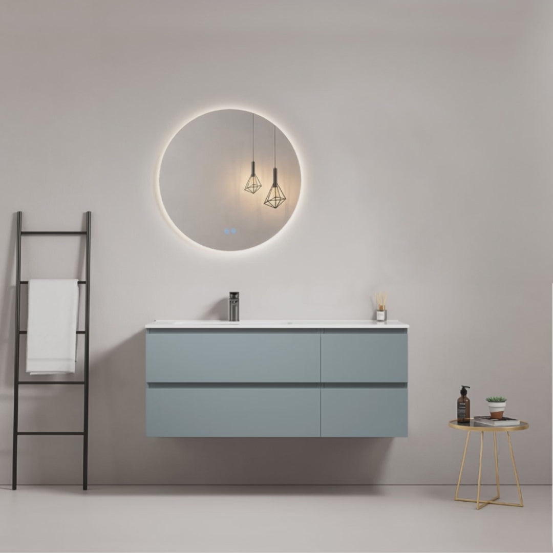 Mobile bagno sospeso 120 cm Blu Avio Lavabo a Sinistra in Ceramica Specchio Tondo Retroilluminato - Fiji Paint