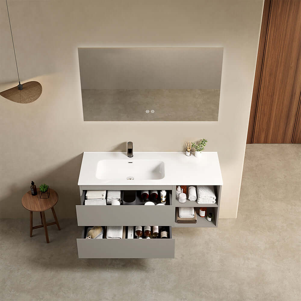 Mobile bagno sospeso 120 cm Grigio Cenere Lavabo a Sinistra in Ceramica Specchio Quadro Retroilluminato - Fiji Paint Plus