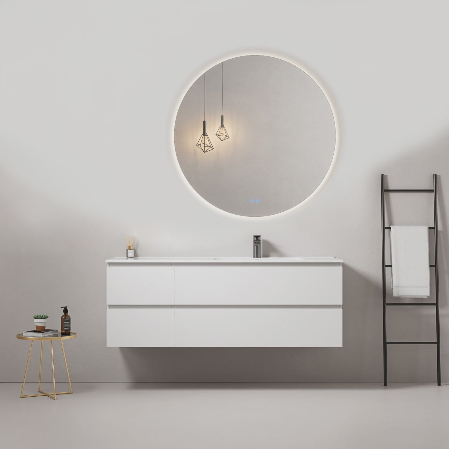Mobile bagno sospeso 140 cm Bianco Lavabo a Destra in Resina Specchio Tondo Retroilluminato - Fiji Paint