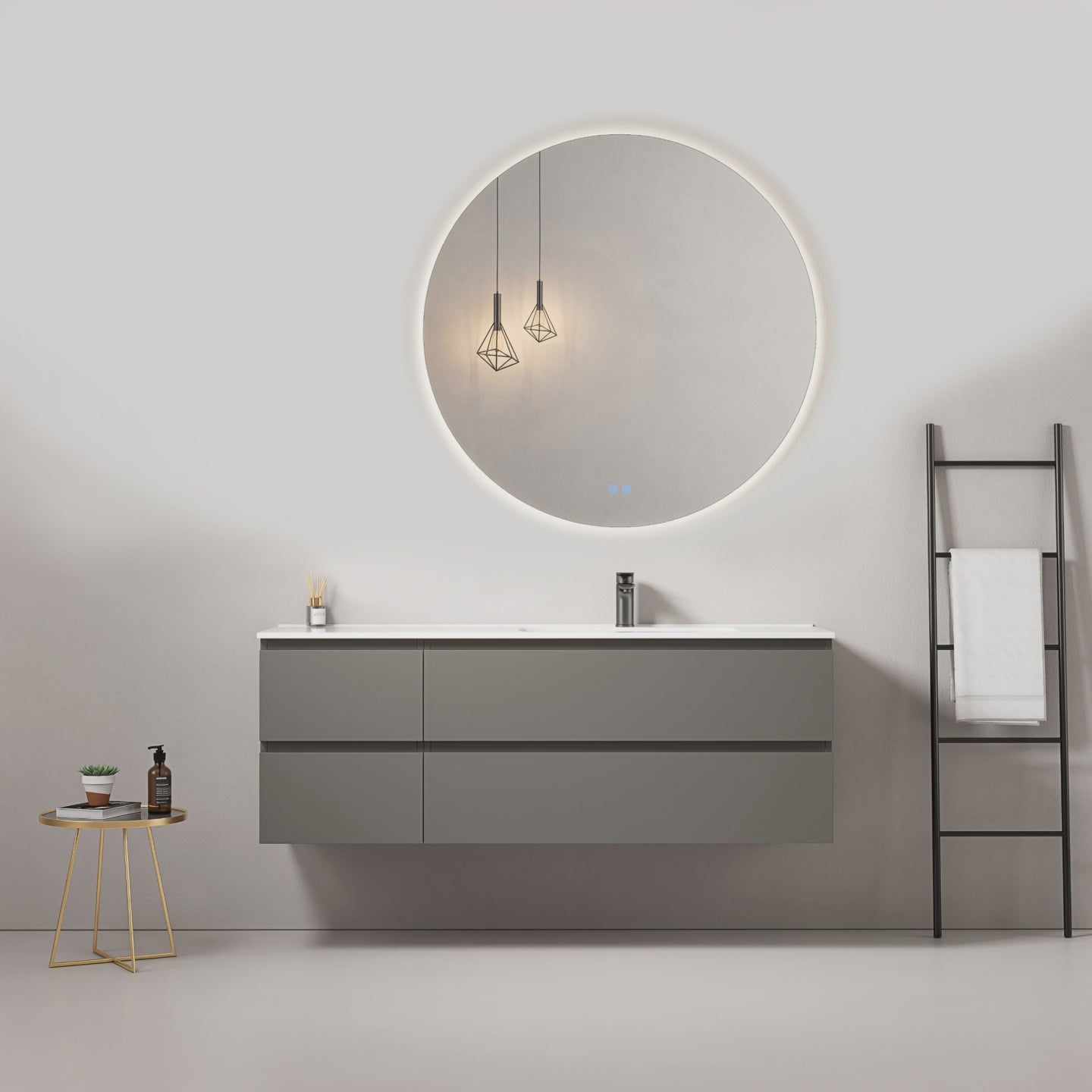 Mobile bagno sospeso 140 cm Grigio Londra Lavabo a Destra in Resina Specchio Tondo Retroilluminato - Fiji Paint