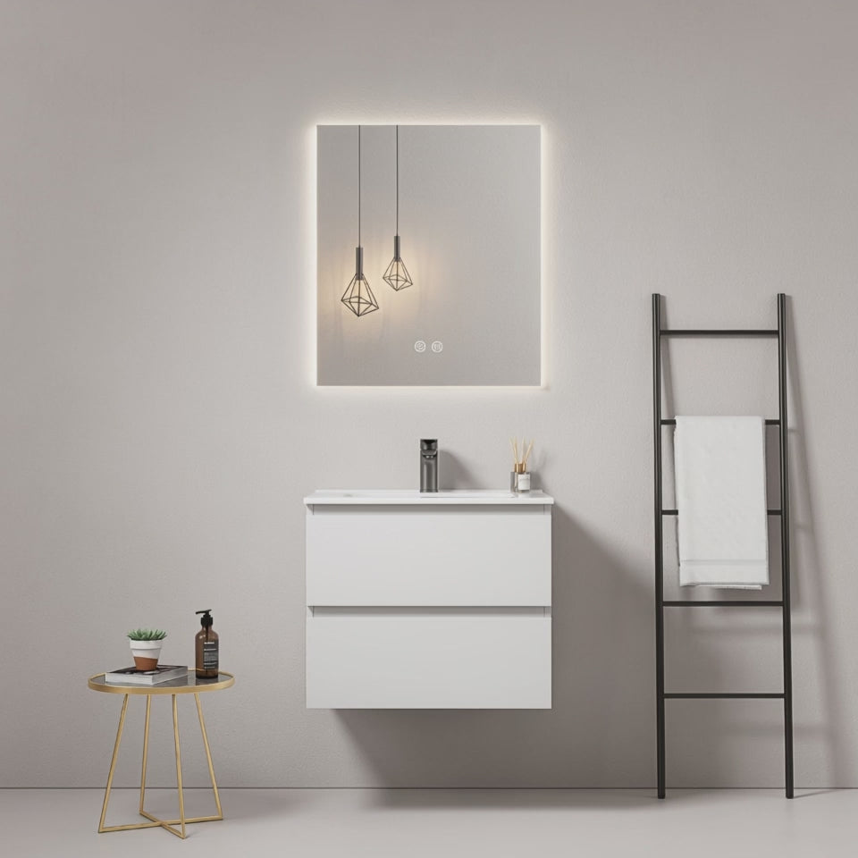 Mobile bagno sospeso 60 cm Bianco Lavabo in Ceramica Specchio Quadro Retroilluminato - Fiji Paint