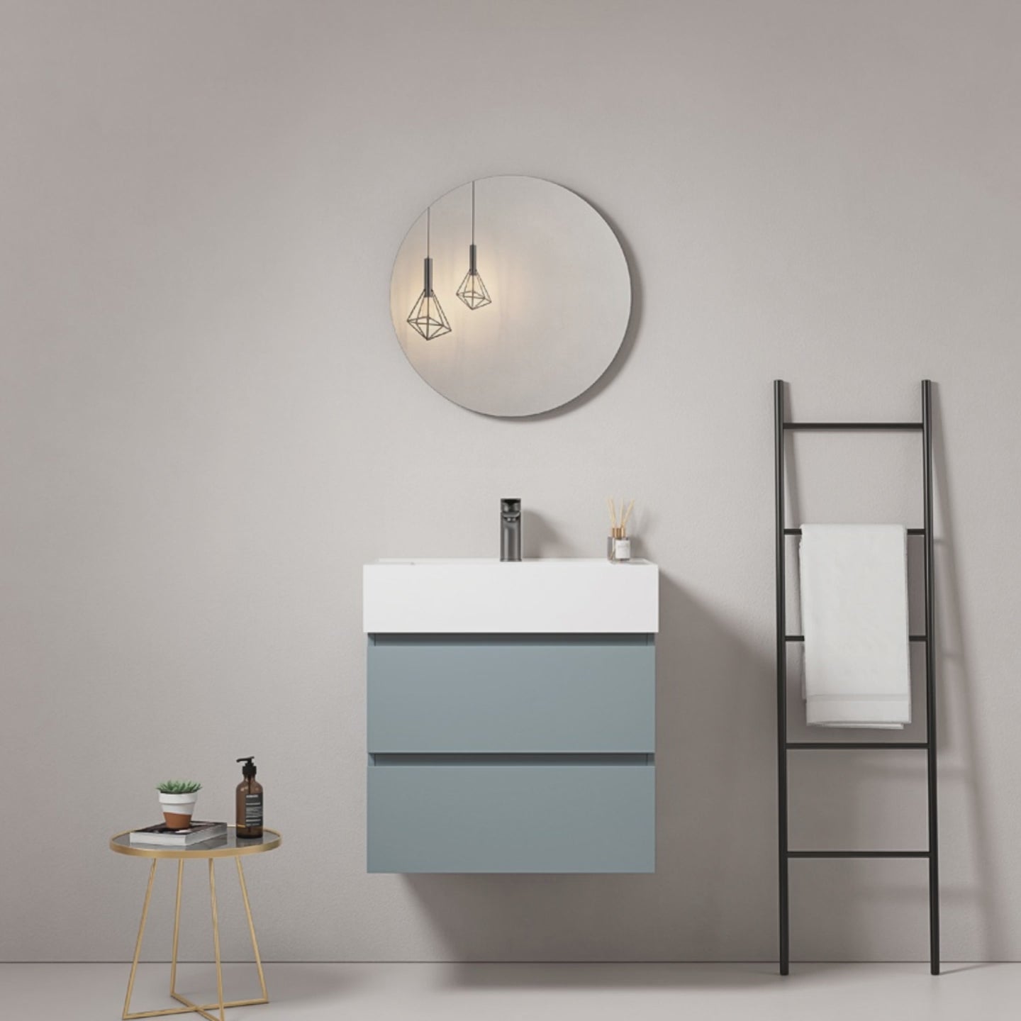 Mobile bagno sospeso 60 cm Blu Avio Lavabo in Resina Specchio Tondo - Fiji Paint