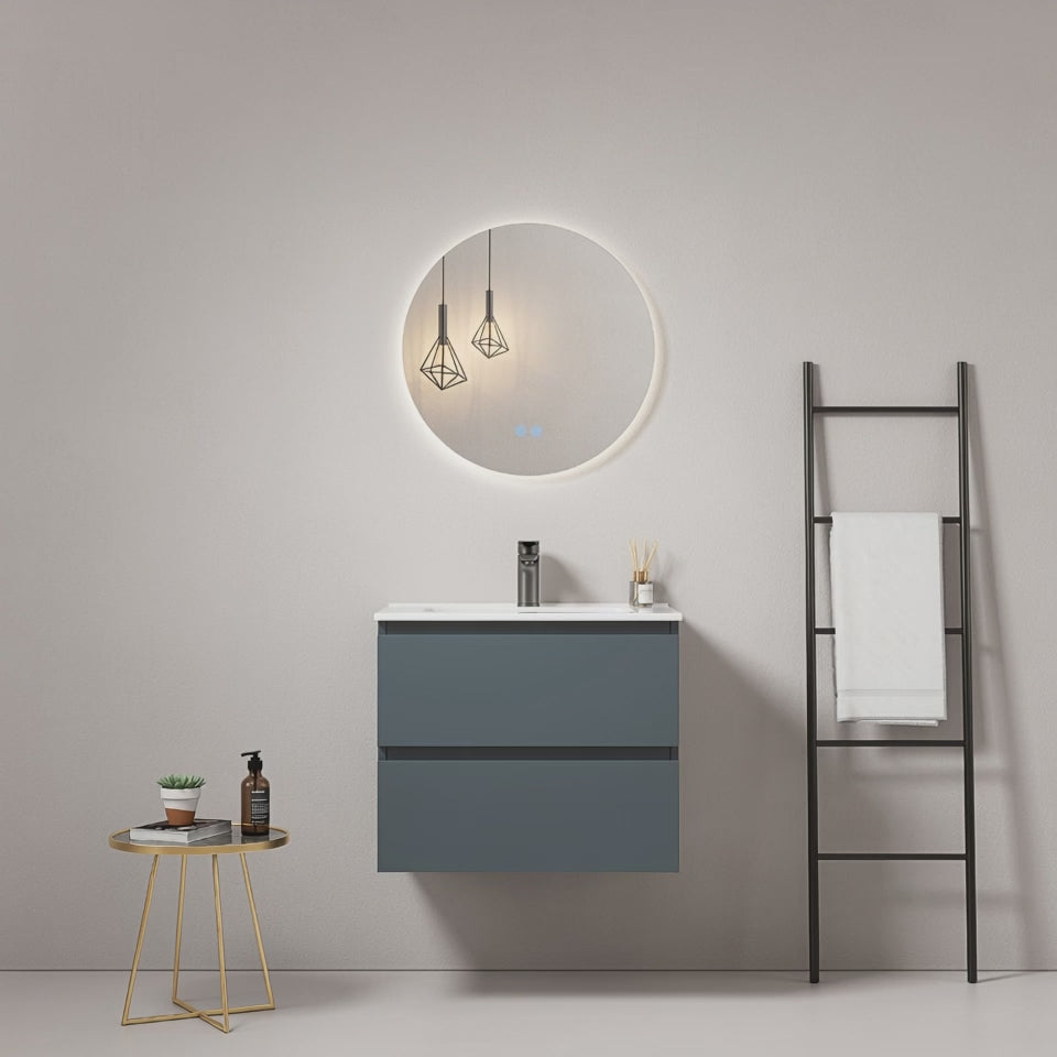 Mobile bagno sospeso 60 cm Blu Mare Lavabo in Ceramica Specchio Tondo Retroilluminato - Fiji Paint